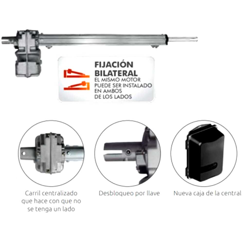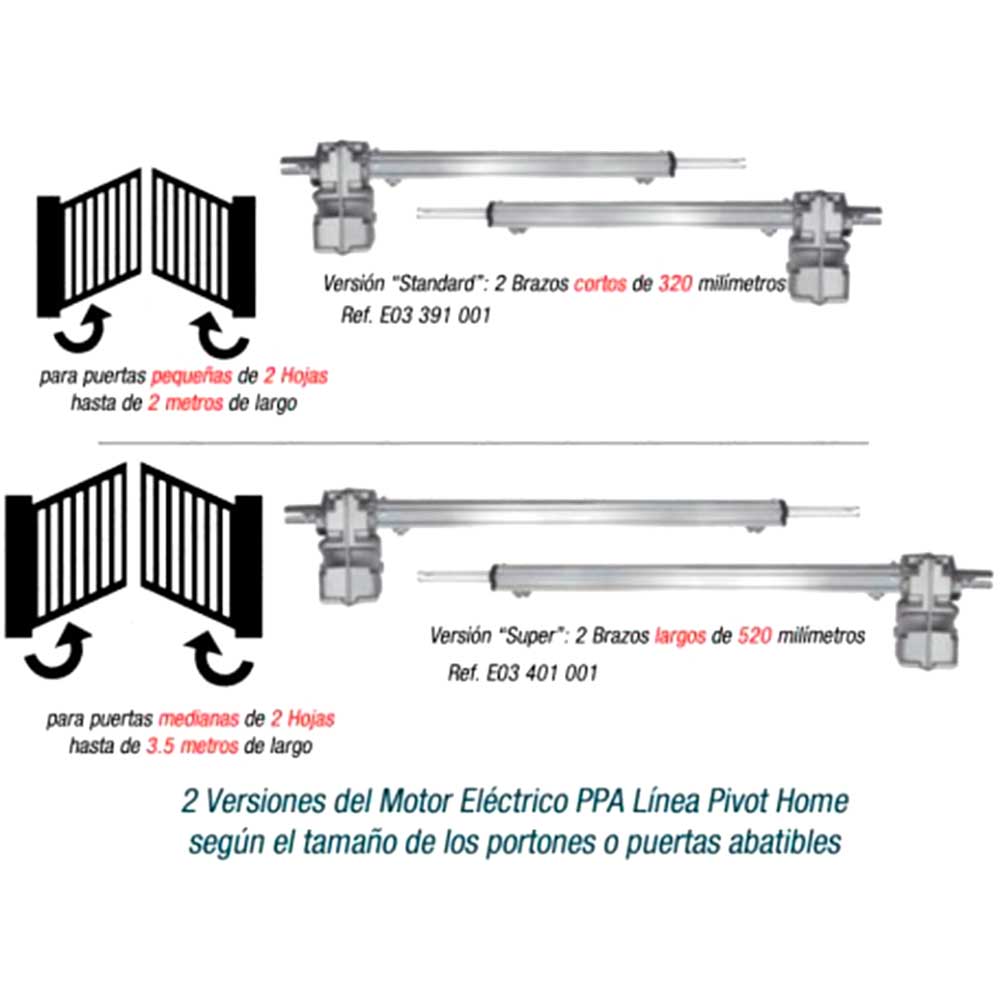 Motores Eléctricos para automatizar la apertura o cierre de puertas abatibles o pivotantes, que son aquellas que giran sobre un eje vertical, ya sea hacia adentro como también hacia afuera, según como funcione el portón de acceso de vehículos en los garajes de casas, conjuntos residenciales, edificios de oficinas o apartamentos, como también de empresas comerciales.
